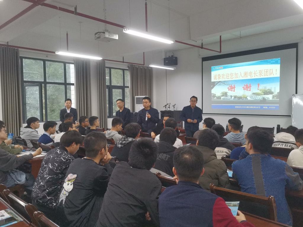 首先,湖南湖电长沙水泵有限公司领导通过一段宣传片向同学们介绍了公司的大致背景,获得的成就,市场领域,研发水平,就业岗位以及企业的理念文化,让同学们对公司有了基本的了解。公司领导对公司的薪酬待遇,待遇包括福利,水泵产品的设计开发,机制工艺设计与市场营销等方面做出了详细的介绍。随后公司领导与同学们进行了亲切的交谈,并且解答了同学们对于就业任职等方面的问题。